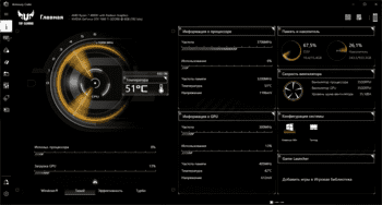 На информационной панели Armoury Crate содержится основная информация о текущей работе системы, включая температуру, частоту, напряжение, скорость вентиляторов и процент нагрузки различных компонентов. Также, вы сможете в один клик изменить режим работы подсветки, изменить скорость вентиляторов или переключить пользовательский профиль.