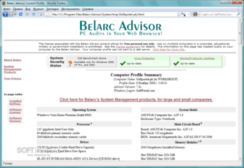 Belarc Advisor — бесплатная программа, которая выводит детальную информацию об установленном в компьютере программном и аппаратном обеспечении, статусе антивируса, установленных и не установленных заплаток (hotfixes) для вашей операционной системы с прямыми ссылками для их загрузки, а также данные CIS (Центр Интернет Безопасности), характеризующие общее состояние безопасности вашей ОС. Полученные результаты отображаются в браузере.