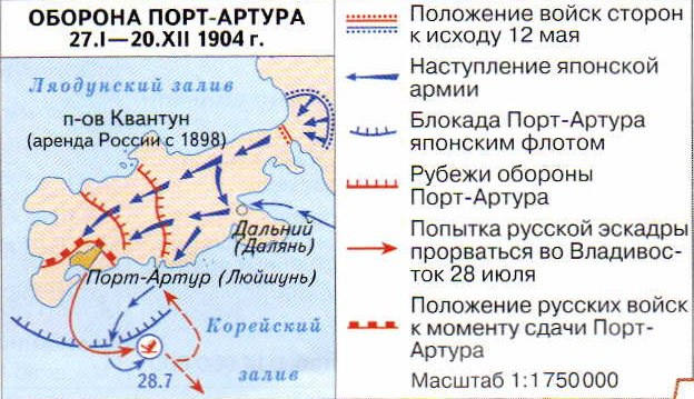 - Август-конец декабря 1904 г. – оборона крепости Порт-Артур . Сухопутная оборону возглавил генерал Р.И. Кондратенко. Он лично руководил обороной на самых опасных боевых участках, а также занимался усовершенствованием военных сооружений. В середине декабря 1904 г. он погиб. Спустя несколько дней, в 20-х числах декабря комендант Порт-Артура А.М. Стесселькапитулировал и сдал крепость японцам. Впоследствии он был обвинён в сознательной сдаче крепости, не исчерпав средств к обороне. Приговорён к расстрелу, который был заменён заключением в тюрьму.