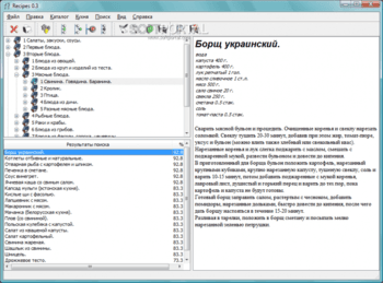 Recipes — Простая в использовании бесплатная программа для хранения кулинарных рецептов позволит Вам вести собственную базу рецептов. Каждый рецепт может содержать неограниченное количество картинок. Возможен поиск рецептов как по ключевым словам, так и по имеющимся продуктам. Для составленного меню можно вывести список необходимых продуктов. Функции импорта-экспорта обеспечивают обмен рецептами между программами через файлы — сборники рецептов с расширением rcp. На данном сайте можно скачать разные сборники рецептов для программы и поучаствовать в расширении базы загрузив на сайт свои рецепты.