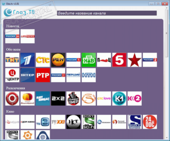 Глаз.ТВ — бесплатное приложение для онлайн просмотра телеканалов в прямом эфире прямо на экране Вашего компьютера. Тут собраны самые популярные ТВ-каналы России и Украины: Первый канал, Россия 24, ТНТ, НТВ, СТС, Россия, Интер, Life News, Comedy TV, НТН, Eurosport, MTV, Nickelodeon, Ностальгия и многие другие. При чем этот список постоянно пополняется. Удобно, что все каналы рассортированы по жанровой тематике и направлениям: Новостные, Развлекательные, Спортивные, Кино, Музыка, Детские, Познавательные, Обо всем и т.д. Глаз.ТВ лишен каких бы то ни было настроек. Запустив приложение, Вам нужно только выбрать интересующий вещатель и наслаждаться просмотром любимой передачи, фильма, матча, мультика и др. Из дополнительных возможностей есть регулятор громкости, полноэкранный режим и опция увеличения/уменьшения картинки. Весьма актуальна кнопка паузы — остановите трансляцию, если это нужно, и возобновите, когда Вам удобно. Важно, что разработчики регулярно проверяют ссылки трансляций, заменяя битые на работоспособные, так что любой доступный канал всегда будет для Вас «в эфире». Что ж, остается только пожелать приятного просмотра ТВ-каналов в любой точке земного шара, где есть доступ в интернет.