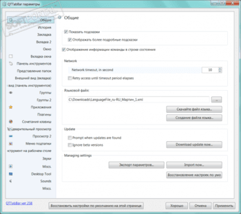 Выбираете нужную строчку и делаете на ней двойной клик мышью, откроется стандартное окно сохранения файла. Выбираете нужную папку и сохраняете .xml файл перевода. Осталось указать его программе, для этого нужно нажать на кнопку с многоточием расположенную в блоке «Language file» и выбрать скачанный на предыдущем шаге файл. Сохраняем изменения, закрываем окно Проводника и запускаем его снова, теперь QTTabBar будет на русском языке.