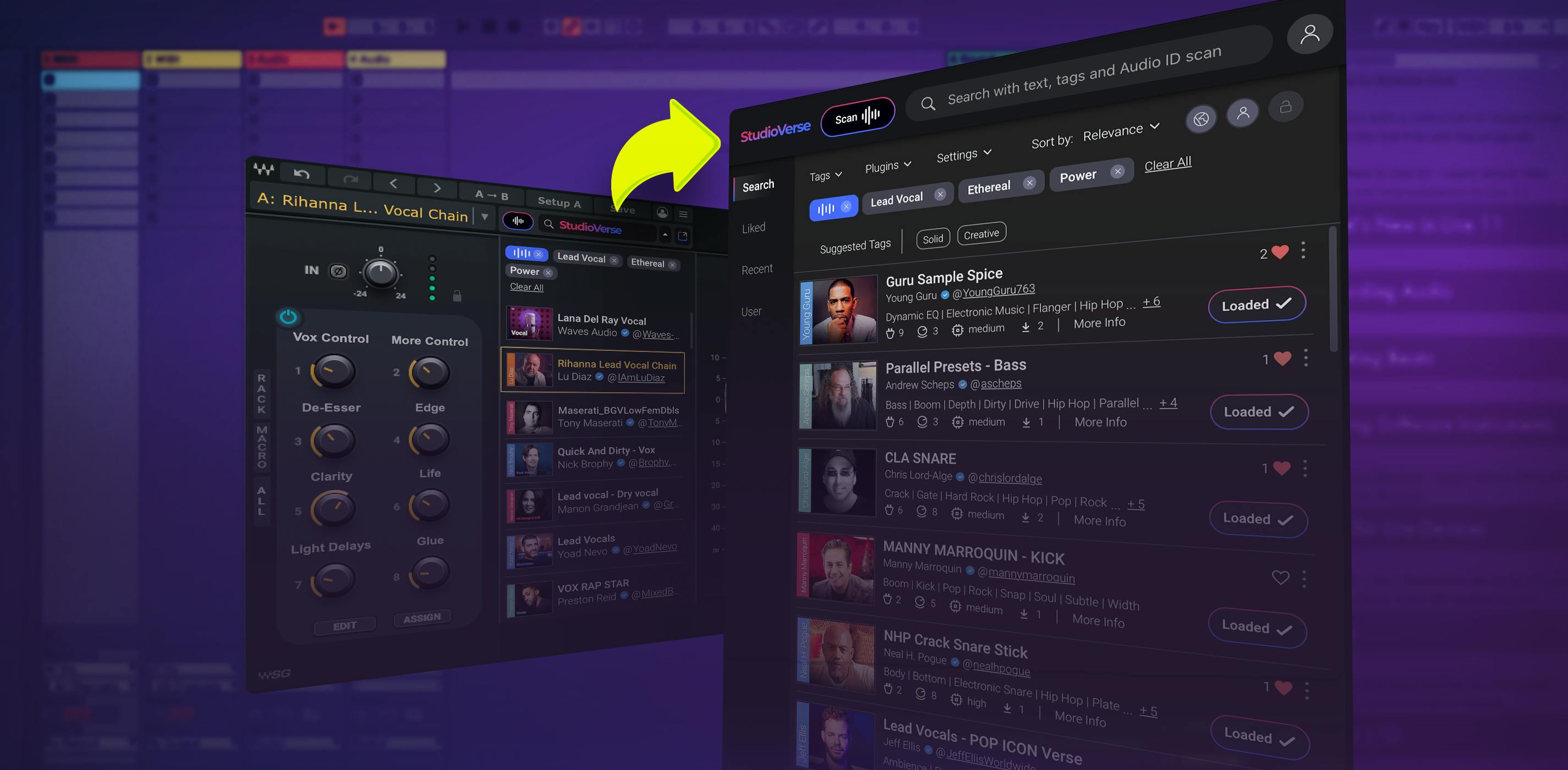 Tell StudioVerse what you want—it will deliver. Just hit the ‘Scan Audio’ button: StudioVerse’s musical machine learning engine will learn your track’s “Audio ID” and instantly recommend mixing chains matching your unique sonic fingerprint.